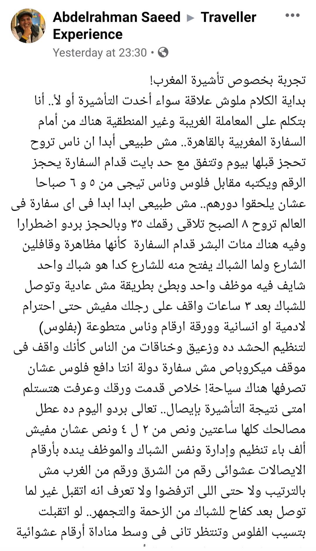 بداية الكلام ملوش علاقة سواء أخدت التأشيرة أو لأ.. أنا بتكلم على المعاملة الغريبة وغير المنطقية هناك من أمام السفارة المغربية بالقاهرة..