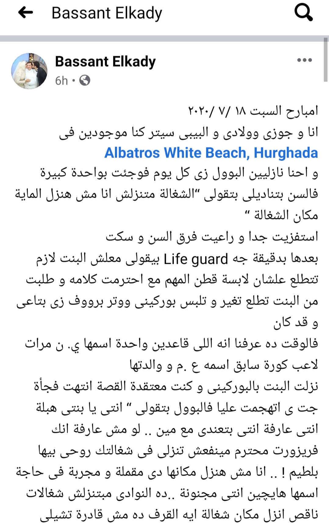 بعدها بدقيقة جه Life guard بيقولى معلش البنت لازم تتطلع علشان لابسة قطن المهم مع احترمت كلامه و طلبت من البنت تطلع تغير و تلبس بوركينى ووتر برووف زى بتاعى و قد كان
