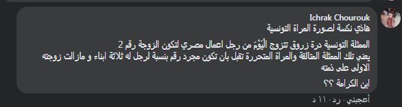 يؤسفني أن أكتب لك هذه الكلمات ولن أهنيك بزواجك لأنه زواج أذل المرأة التونسية. كيف ترضين سيدتي أن تكوني ضرة ولا درة؟